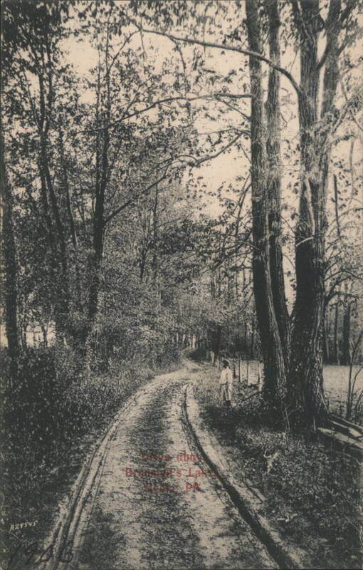 A winding dirt road through a dense forest, with a person standing on the right side near large trees.