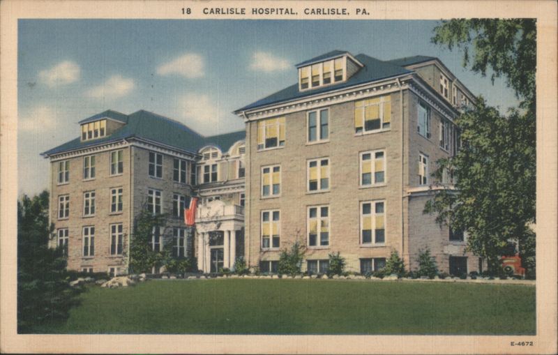 The front shows a multi-story brick hospital building with numerous windows, a large green lawn, and surrounding trees under a blue sky.