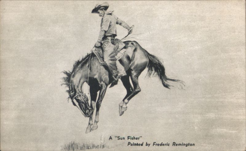 Reproduction of a painting by Frederic Remington, depicting a cowboy on a bucking horse, a maneuver known as 'sun fishing.'