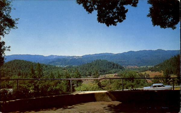 Panoramic view of green - clad hills of Upper Napa Valley, as seen from main entrance to the sanitarium section. Wide verandas provide opportunity to relax and enjoy this beautiful natural setting the year around.