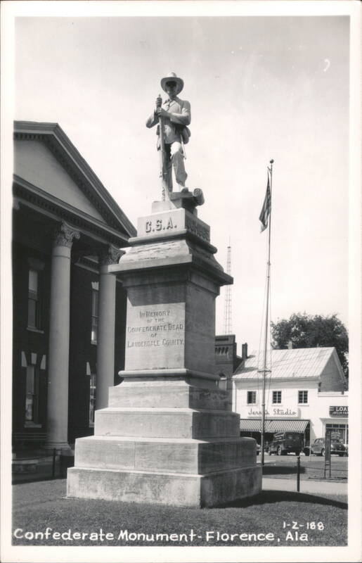 View of the Confederate Monument featuring a soldier statue, with a large building with columns visible to the left. The monument is inscribed 'C.S.A.', 'FORGUS', and 'IN MEMORY OF THE CONFEDERATE DEAD'. A flagpole with a flag stands to the right.