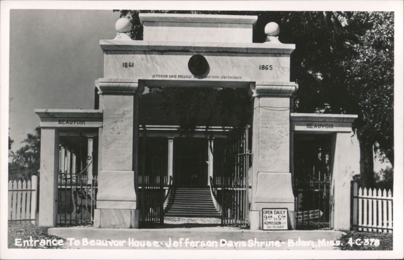 Monument with dates 1861-1865 and text 'Jefferson Davis President Southern Confederacy'. A sign indicates 'Open Daily 9AM to 5PM ADMISSION 50ยข ON HOLIDAYS'.