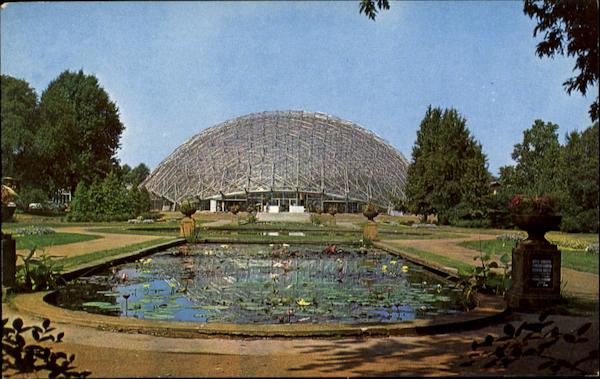 Geodesic dome tropical display house of the Missouri Botanical (Show's) Garden, St. Louis, Mo. Made of aluminum framework, lined with Plexiglas, the Climatron, which is 175-ft. In diameter and 70-ft. high, houses part of the Garden's extensive tropical collection under controlled conditions making possible varied displays in one vast enclosure. |