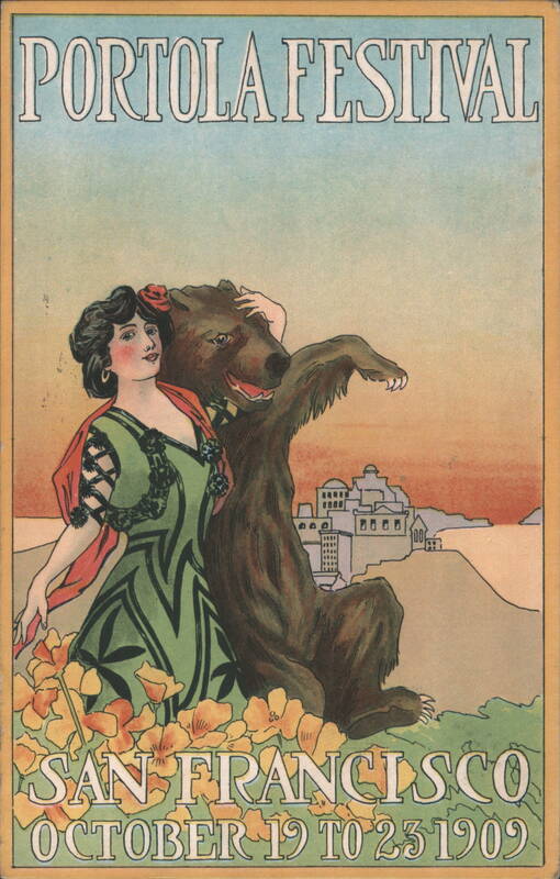 | A stylized woman in a green gown and red shawl stands with a large brown bear, its paw on her shoulder. In the background, a city skyline of San Francisco is visible on hills under a sunset sky. Orange flowers are in the foreground. The card advertises the Portola Festival, held October 19 to 23, 1909. |
