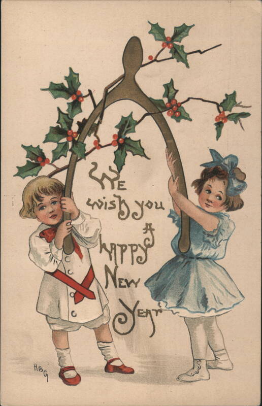 Children Holding Wishbone with Holly, Happy New Year Greeting