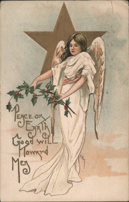 A graceful angel with large wings, dressed in a flowing white gown, holds sprigs of red-berried holly. A large golden star is in the background, and the text 'Peace on Earth Good Will Toward Men' is prominently displayed.
