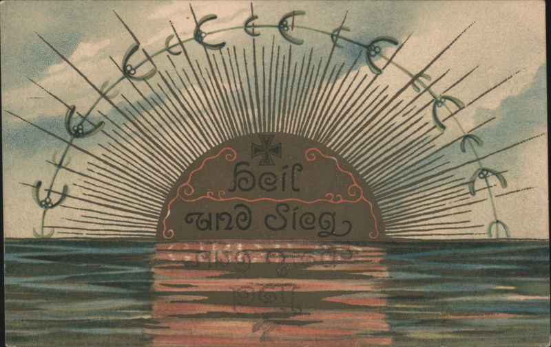 | An illustrative depiction of a rising sun over water, with rays extending upwards. An arc of crescent moons is above the sun. In the center of the sun, an Iron Cross symbol is visible, surrounded by the German phrase "Heil und Sieg" (Hail and Victory). |