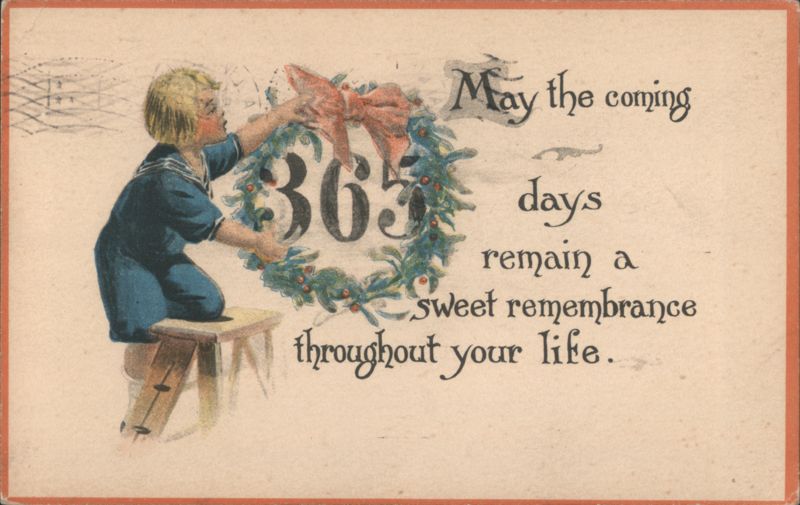 New Year's Greeting with Child Tying Bow on Wreath, 363 Days