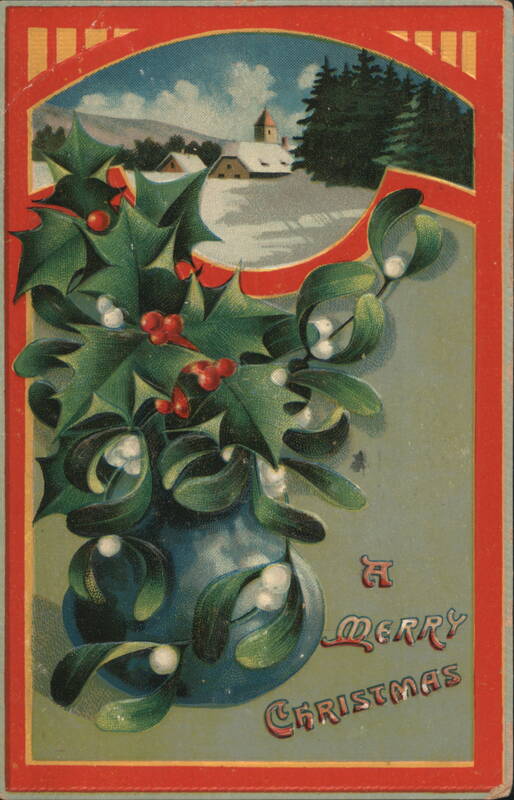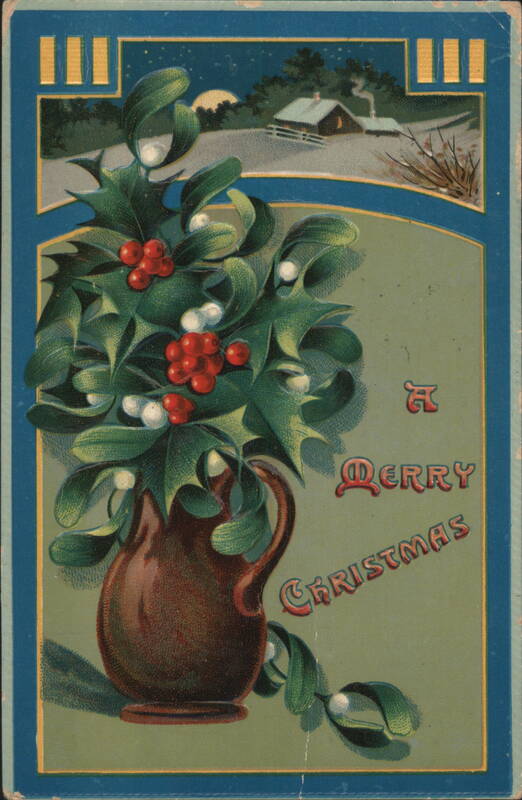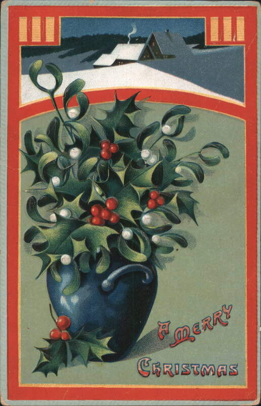 The illustration features a blue vase overflowing with green holly leaves and red berries, along with white mistletoe. In the background, a snowy landscape with houses and trees under a blue sky is visible through a red-framed arch. The text 'A Merry Christmas' is at the bottom right. Holly and Mistletoe in Pitcher, Snowy Cabin Scene The front features a festive arrangement of green holly with red berries and mistletoe with white berries, presented in a brown pitcher. In the background, a serene winter landscape is visible under a full moon, with a snow-covered cabin and bare trees. The greeting "A Merry Christmas" is prominently displayed. A Merry Christmas Holly and Mistletoe Vase Winter Village Scene A festive arrangement of holly with red berries and mistletoe with white berries in a vase, set against a snowy village landscape with evergreen trees. |