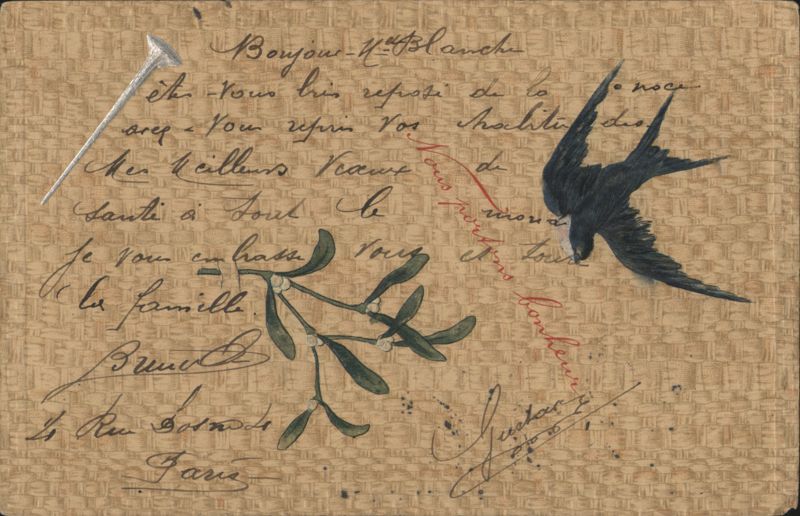 | A postcard featuring a swallow in flight, a sprig of mistletoe with berries, and a metal nail, all against a textured background. A handwritten message in French is addressed to 'M Blanche' from 'Bruno' in Paris, inquiring about her wedding and sending best wishes for health. |