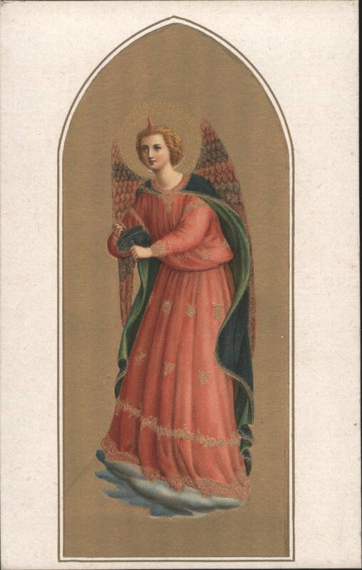 A blonde-haired angel with large brown wings, dressed in a flowing blue gown with gold trim, holds a red instrument decorated with a white snowflake pattern. A halo and a small flame are above the angel's head. The image is set within an arched frame. Angel Playing Cymbals by Beato Angelico An angel with a halo, red dress, and green cloak, holding cymbals, depicted within an arched frame. Angel Playing Drum by Beato Angelico Angel in Prayer by Beato Angelico An angel with a halo and large wings, dressed in a flowing blue robe with gold embellishments, stands with hands crossed over the chest, appearing to be in prayer or contemplation, atop a cloud formation. Angel in Prayer by Fra Angelico A full-length depiction of an angel with red wings and a flowing red robe, standing on clouds with hands clasped in prayer. The angel has a halo and a small red flame on its head, rendered in a classical art style. Angel Playing the Sistrum by Beato Angelico A winged angel with a halo, dressed in a long, flowing gown, holds and plays a sistrum. The angel stands on clouds within an arched border. Angel Playing Trumpet by Beato Angelico A winged angel in a green robe, standing on a cloud, blows a trumpet. A halo is visible above the angel's head. Angel Playing Organ by Beato Angelico An angel with a halo and wings, wearing a blue gown and a green cloak, stands on clouds while playing a small pipe organ. Angel Playing White Cymbal by Beato Angelico The angel has a halo and large wings, wearing a long, pleated robe, and stands on a cloud within a gothic arch frame. Angel Playing Trumpet by Beato Angelico An angel with wings and a halo, dressed in a red robe, blows a long golden trumpet. The angel stands on a cloud-like base within an arched frame. Angel Playing Violin, Attributed to Fra Angelico The front features an angel with large wings, a halo, and a red spike on its head, dressed in a red gown and green cloak, playing a violin while standing on a cloud. Angel Playing Trumpet by Fra Angelico |