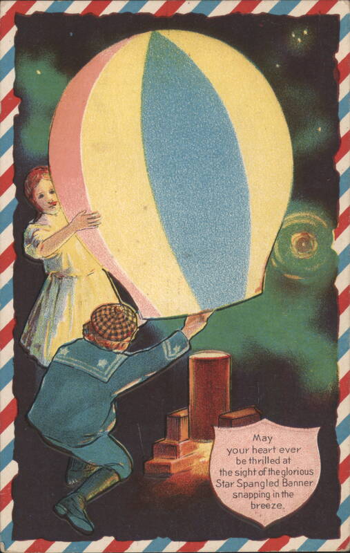 | A young boy in a sailor suit and a girl in a white dress are depicted under a starry night sky, holding onto a large, glowing hot air balloon with red, yellow, and blue stripes. The scene is framed by a red, white, and blue striped border. A quote reads: "May your heart ever be thrilled at the sight of the glorious Star Spangled Banner snapping in the breeze." |