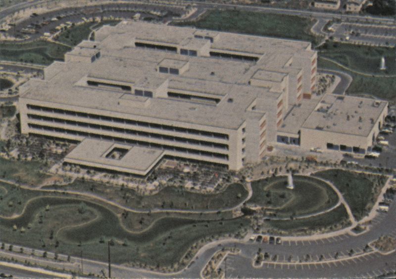 The hospital is 85 feet tall, with 4 floors equal to an 8-story building, and 8-foot service floors. It has 725,000 square feet, located on a 34-acre site. Bed capacity includes 216 Medical, 164 Surgical, 60 Psychiatric, and 60 Nursing Home beds. Emergency fuel and water tanks provide a 4-day supply and operate a 2500 KW generator. A computerized pneumatic tube system connects 70 message stations, and an automated transport system carries food, linen, and general supplies. It includes 40,000 net square feet of research laboratories and an auditorium with 250 seats. |