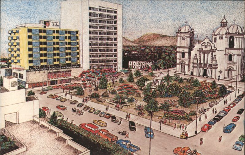 A colorful drawing depicting Barahona Park with surrounding buildings, including Banco Atlántida and Sula, and two prominent churches.