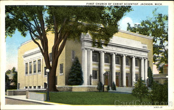Front: FIRST CHURCH OF CHRIST SCIENTIST, JACKSON, MICH. HURCH OE CHRIST SCIENTIST liil 4362-29 Back: PUBLISHED BY W. J. BEARDSLEY, JACKSON, MICH. C. T. AMERICAN ART COLORED TO CAC