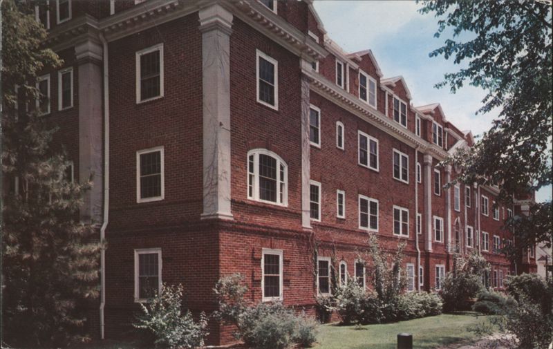 The image depicts a multi-story brick building with white trim and numerous windows, set amidst green lawns and trees.