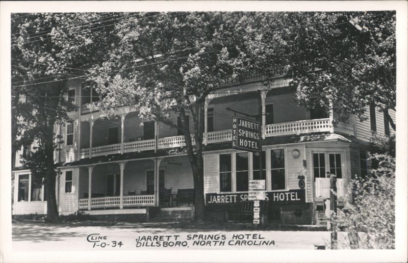 Multi-story hotel building with porches, surrounded by trees. Road signs for Waynesville, Asheville, Bryson City, and Murphy are visible.