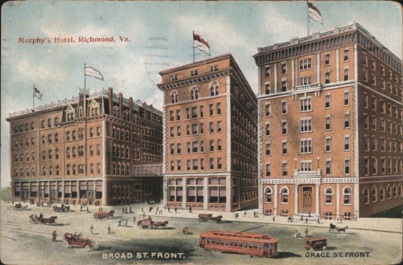 Three large brick hotel buildings with people and vehicles on Broad St. and Grace St.