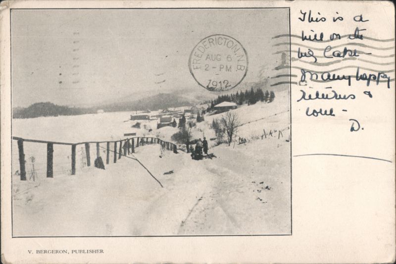 Winter scene with a snow-covered village nestled among hills, a fence line, and figures on a path.