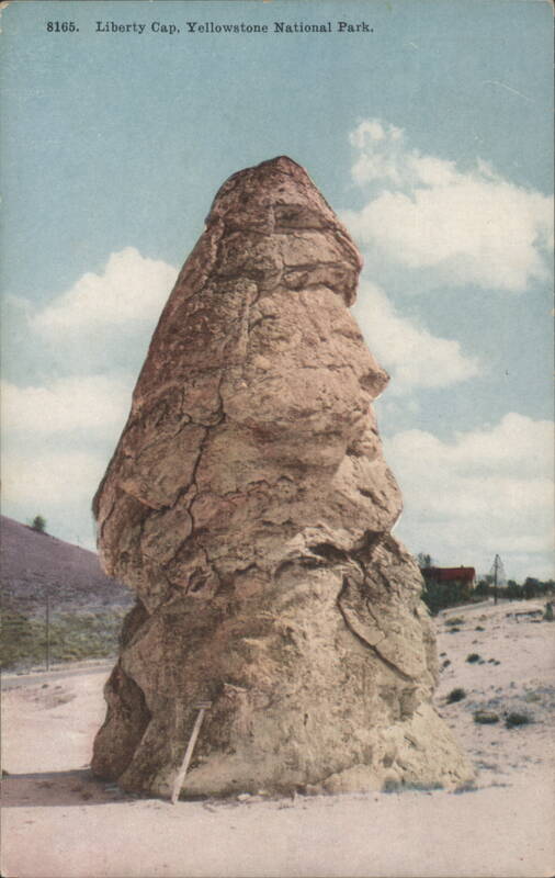 This peculiar formation is an extinct hot spring cone, standing at the foot of Terrace Mountain. It is 52 feet high and 20 feet in diameter and is formed of overlapping layers of deposit.