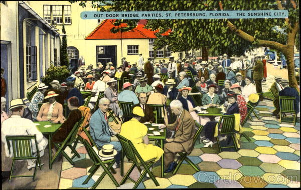 An unusual sight is this daily playing of Bridge. The weather conditions of the Sunshine City are such that Bridge parties are arranged and take place throughout the entire season. Close by are Mirror Lake, The Coliseum and the Shuffleboards. |
