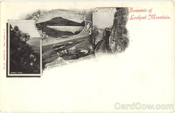 Front: NARROW GAUGE RY LOOKOUT MT: Souvenir of Lookout Mountain. LOOKOUT MOUNTAIN E. C. KROPP, PUBL MILWAUKEE NO. 76. UMBRELLA-ROCK. SUNSET ROCK Back: 200 FOR EIGN