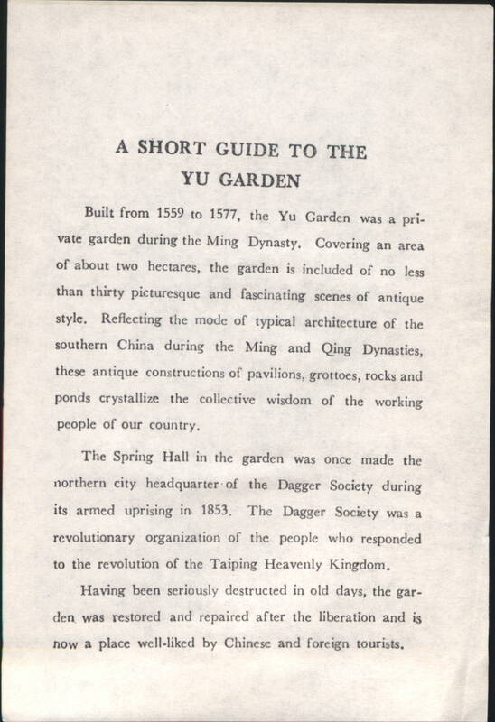 A Short Guide to the Yu Garden Built from 1559 to 1577, the Yu Garden was a private garden during the Ming Dynasty. Covering an area of about two hectares, the garden is included of no less than thirty picturesque and fascinating scenes of antique style. Reflecting the mode of typical architecture of the southern China during the Ming and Qing Dynasties, these antique constructions of pavilions, grottoes, rocks and ponds crystallize the collective wisdom of the working people of our country. The Spring Hall in the garden was once made the northern city headquarters of the Dagger Society during its armed uprising in 1853. The Dagger Society was a revolutionary organization of the people who responded to the revolution of the Taiping Heavenly Kingdom. Having been seriously destroyed in old days, the garden was restored and repaired after the liberation and is now a place well-liked by Chinese and foreign tourists. Tower of Joy, Traditional Chinese Garden, Shanghai Ornate buildings with traditional architecture, a large rockery, and a pond with reflections. Several people are relaxing in the garden. Dragon Wall Plum Wife & Crane Son Clay Sculpture, Lin Bu Hermit Earthen Image of a famous celibate hermit who was a great lover of plum flowers and storks. Hall of Nine Lions, Shanghai Garden Pavilion Shanghai Chinese Garden Compound Corridor Snow on the Nine-bend Bridge, Shanghai Yu Ling Long Rockery, Exquisite Jade Garden Tower of Driving Rains A multi-story traditional Chinese building with ornate roofs, overlooking a pond filled with red and orange koi fish. People are visible on the building's balconies. Qing Dynasty Stone Lion |