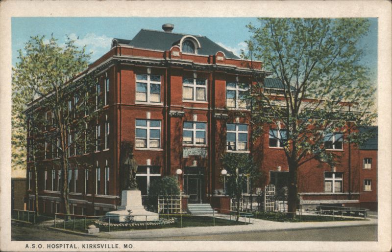 A large, multi-story brick hospital building with numerous windows, surrounded by mature trees. A statue stands prominently in front of the main entrance.