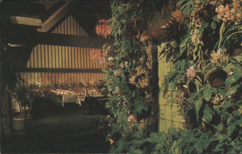 | Hawaii's finest and oldest-established dinner house, Canlis' Restaurant in Waikiki, known for its award-winning elegance, Hawaiian-Modern art and architecture. The interior features lush greenery, chandeliers, and set tables, offering cocktails and dinners from its magnificent charcoal broiler. |