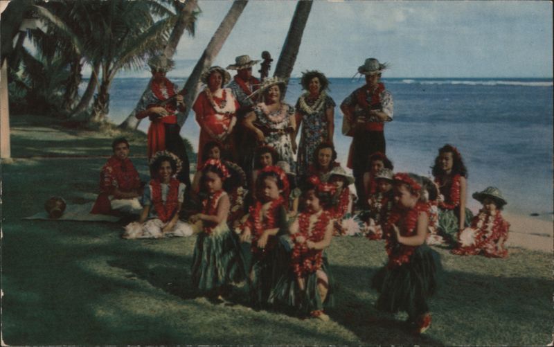 Near a tropical island beach, keikis and their elders present a typical, tuneful, bit of colorful Hawaii.