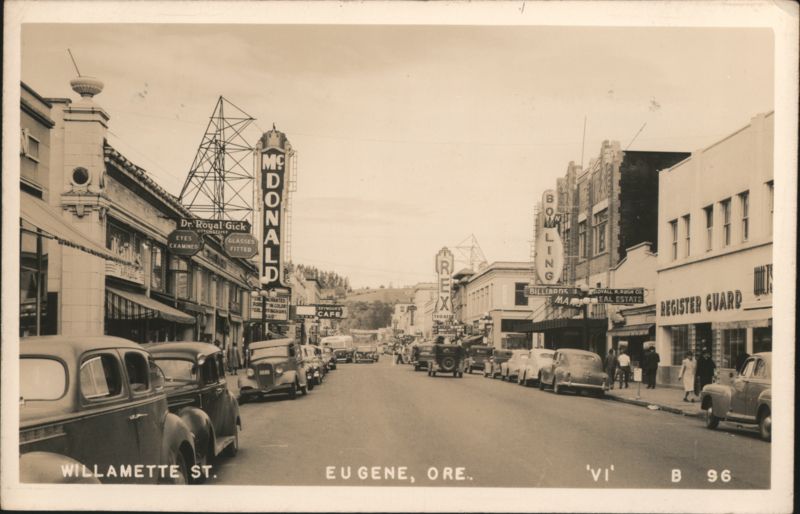 | Street view looking down Willamette Street featuring vintage automobiles and storefronts. Visible signs include the McDonald Theatre marquee advertising 'The Enchanted Forest', Rex Theatre, Dr. Royal Gick Optometrist, Seymour's Cafe, Bowling, Billiards, Loyall R. Rugh Co. Real Estate, and the Register Guard building. |