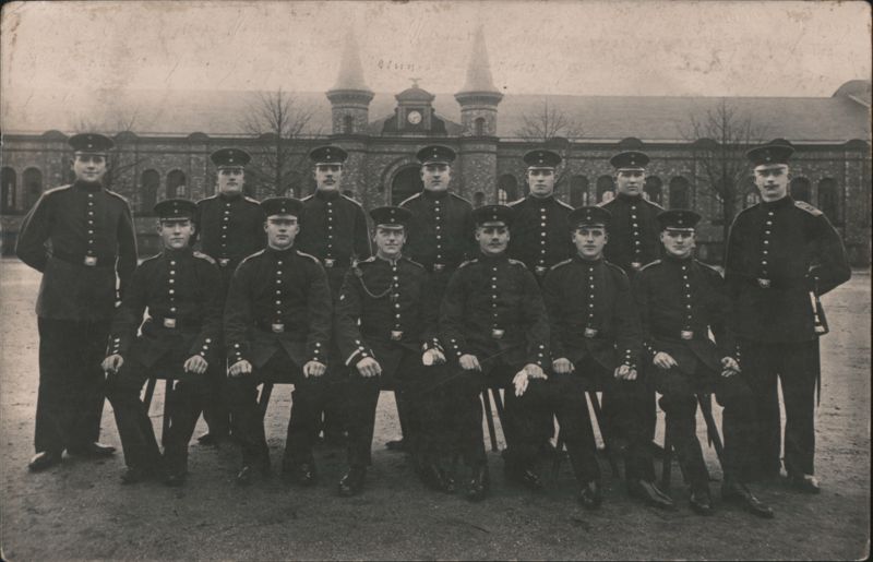 | Group of thirteen men in military uniforms posing in front of a large brick building with twin towers and a central clock. Photographer imprint: Otto Petermann, Photograph, Aachen. Postmarked Aachen with a green 5 Pfennig Deutsches Reich stamp. Addressed to Anton Breidenbach in Kapellen bei Grevenbroich. |