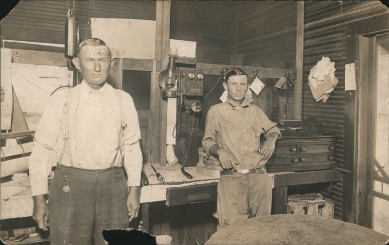 | Interior scene of a butcher shop featuring two men. The older man on the left wears suspenders, while a younger employee leans on a counter to the right. The shop is furnished with a hanging scale, wall-mounted telephone, wooden drawer cabinet, and a large chopping block. Butcher tools are visible on the work surface. Handwritten note on reverse reads "Uncle Ed & help in his Meat Market" and "Texas". |