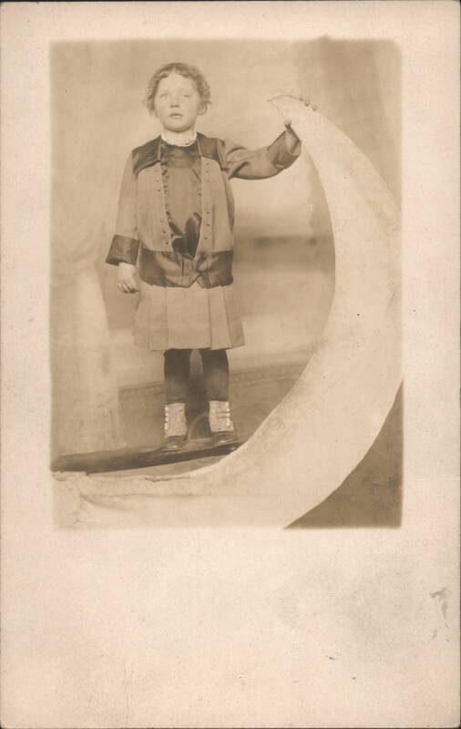 A young child stands on a large crescent moon studio prop, holding the upper tip with one hand. The child is dressed in a buttoned tunic with a wide collar, a pleated skirt, dark stockings, and high-button boots against a painted backdrop.