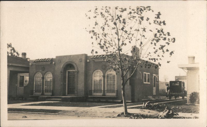 Single-story Spanish Colonial Revival or Mission style home featuring a flat roof with parapets, a central arched doorway, and large arched windows with iron railings. A young tree grows in the front lawn. A vintage 1920s touring car is parked in the side driveway with a person standing next to it. The AZO stamp box on the reverse with two triangles pointing up and two down dates this image to between 1918 and 1930. |