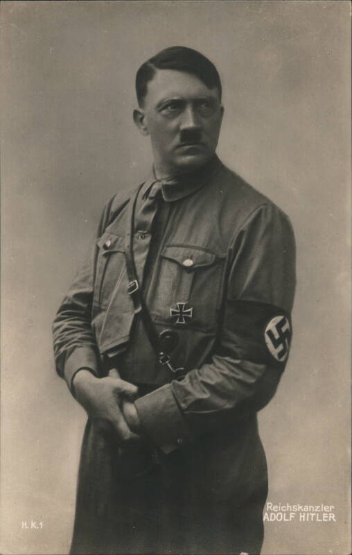 | Three-quarter length studio portrait of Adolf Hitler looking to the right. He is wearing a uniform with a Sam Browne belt, an Iron Cross medal on his left breast pocket, and a swastika armband on his left sleeve. Text at bottom right reads "Reichskanzler ADOLF HITLER". The reverse features a handwritten message in German dated May 3, 1933, from Halle. |