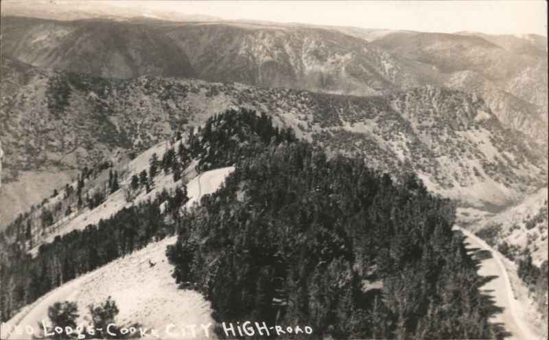 Real photo view looking down on a winding section of the Red Lodge-Cooke City High-Road, cutting through pine forests on a mountain ridge with distant peaks in the background.