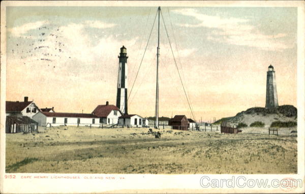 Front: 9152. CAPE HENRY LIGHTHOUSES OLD AND NEW VA. COPYRIGHT 1905. BY DETROIT PUBLISHING Co Back: TRESS MONROY OCT 17 12.30PM 1901 50 UNITED STATES OF Miss Mildred A. Brown 204 orn ANKLIN 1790 POS CEEN Ниш Нами Conn.