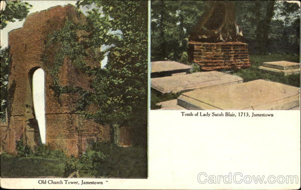 Front: Old Church Tower, Jamestown Tomb of Lady Sarah Blair, 1713, Jamestown Back: AUTHORIZED BY ACT OF CONGRESS MAY 19. 1898. PRIVATE MAILING CARD POSTAL CARD (CARTE POSTAL) Two Cents