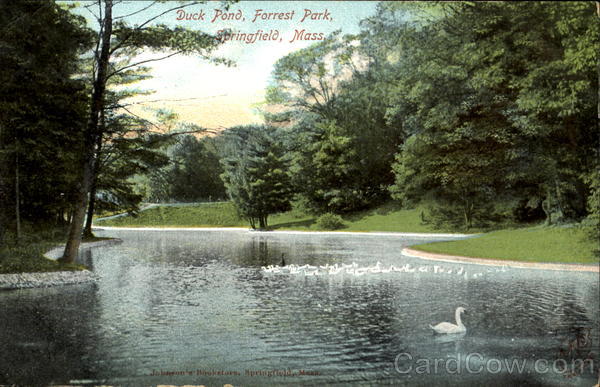 Front: Duck Pond, Forrest Park, Springfield, Mass Johnson's Bookstore, Springfield, Back: COPYRIGHTED We DEMARK No. 7850. The Metropolitan News Co., Boston, Mass. & Germany. LW