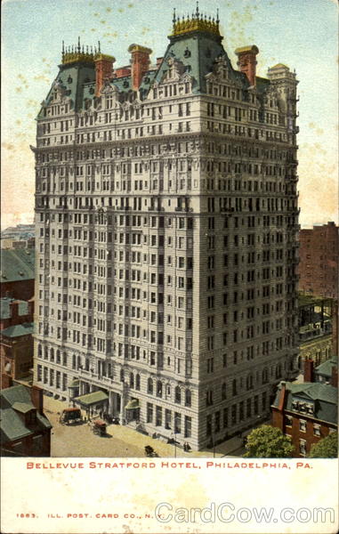 Front: EETE BELLEVUE STRATFORD HOTEL, PHILADELPHIA, PA. 1863. ILL. POST. CARD CO., N. Y. Back: DOMESTIC AND Two CENTS