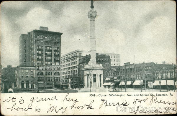 Front: it & grand here 5304 Corner Washington Ave. and Spruce St., Scranton, Pa how is may burk. Bessie 595 Prescon Scanter que Back: ANION 1906 UNITED STATES OF 1706ANKLIN 1790 Box 72.). Pub by C. S. Woolworth Thiss Mary Lawler May brooke ver n. J.