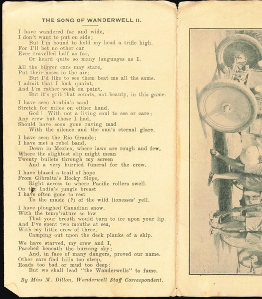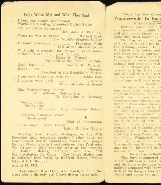 | Detailed account of the Wanderwell Expedition, starting from Detroit, MI in November 1921, racing Ford cars across 39 countries and 4 continents. Features Miss Aloha Wanderwell, pilot of car No. 3, and the expedition's journey to Shanghai. |