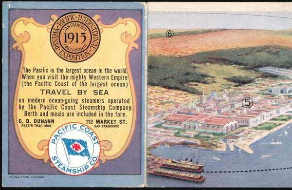 Illustrated map showing sea travel routes to the Panama-Pacific International Exposition in San Francisco, highlighting the Pacific Coast Steamship Company and key landmarks like the Golden Gate and Exposition Grounds.