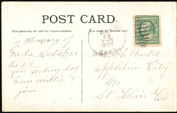 | A picturesque view of a stream winding through a lush green forest, framed by a decorative border of vibrant red flowers and green foliage. The reverse side includes a handwritten message and address, along with a one-cent US postage stamp. |
