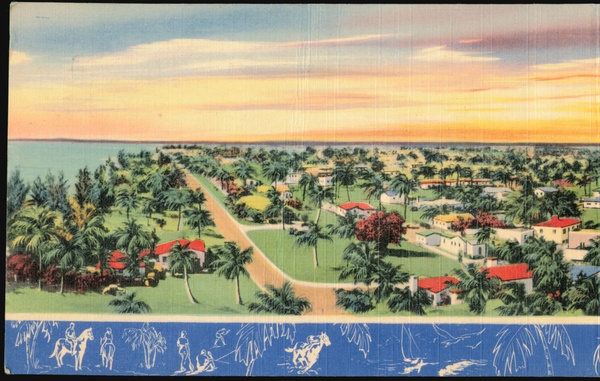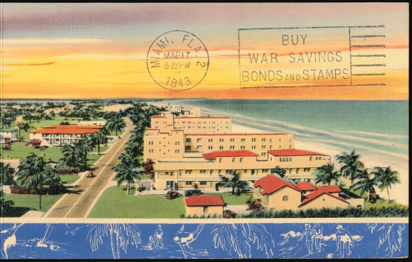 | Aerial view of Surfside, a desirable residential community in Dade County, Florida, bordered by the Atlantic Ocean and Biscayne Bay, featuring hotels, houses, and palm trees under a sunset sky. The card promotes buying War Savings Bonds and Stamps. |