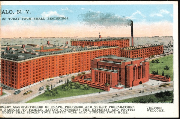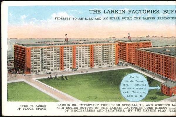 | An aerial view of the extensive Larkin Factories complex, showcasing multiple large brick buildings and surrounding green spaces. The card highlights the company's growth from a small factory in 1875 to a major manufacturer of soaps, perfumes, toilet preparations, and pure food products, operating on a direct-to-family sales model. Details about product shipments and the Larkin Plan are also provided. |