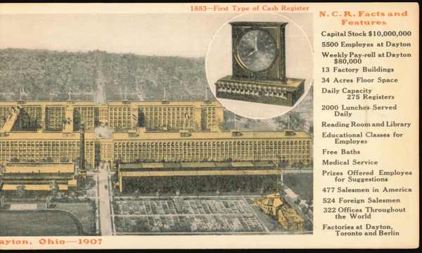 | Features the NCR factory complex in Dayton, Ohio, with insets showing the 1883 First Cash Register Workshop and the 1883 First Type of Cash Register. Includes 'N. C. R. Facts and Features' and details of the 'Highest Type of Cash Register No. 109-9 Multiple Drawer' on the reverse. |