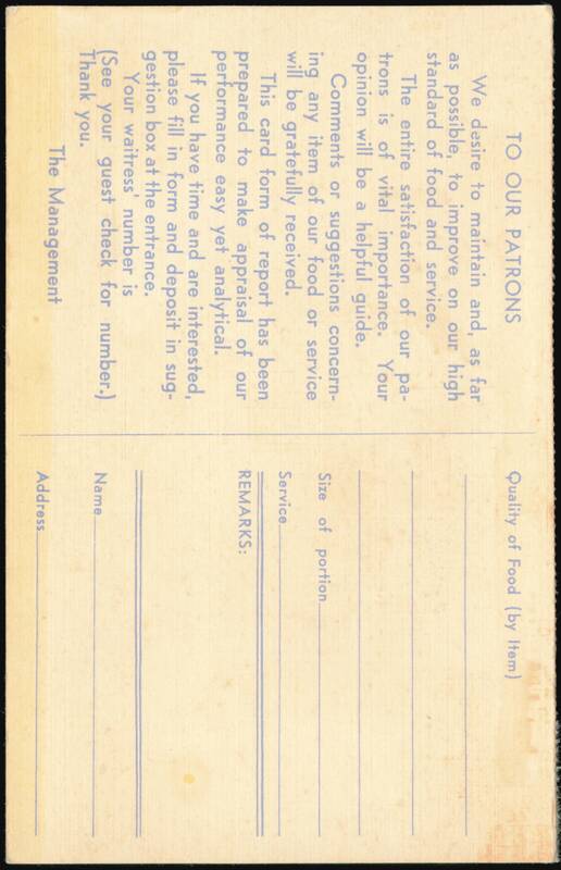 Card for patrons to provide feedback on food quality, portion size, and service, with fields for remarks, name, and address. Instructions encourage depositing the card in a suggestion box.