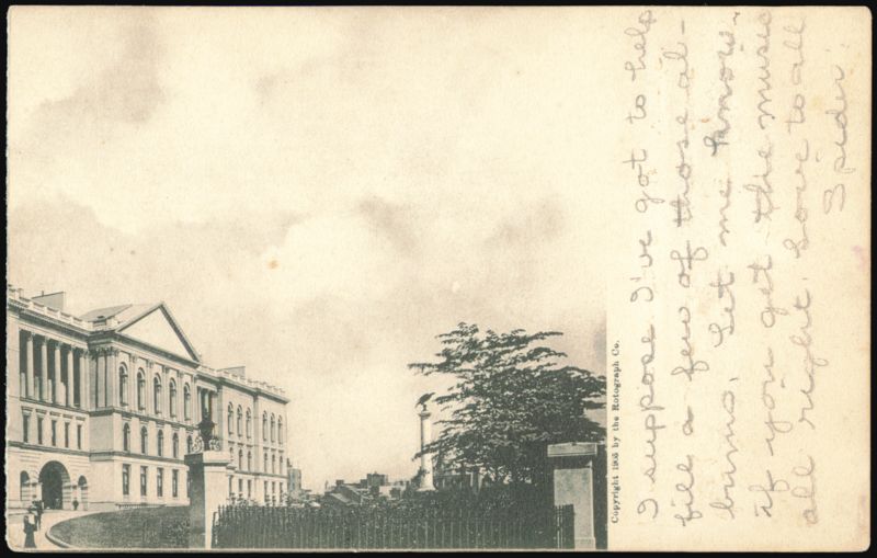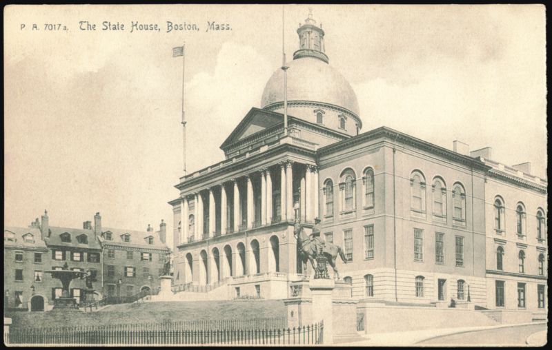 Cards are separated A view of the Massachusetts State House in Boston, featuring its distinctive dome and columns. The building is surrounded by green lawns and trees, with a statue visible in the foreground. The image has a sepia tone, characteristic of early postcards. |